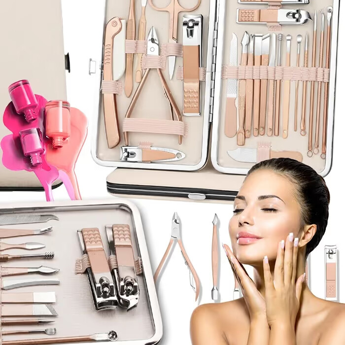 Kompletan set za manikuru neophodan je za svaku ženu koja želi brinuti o svojim noktima. Alati su uredno smješteni u elegantnu, mekanu kutiju.