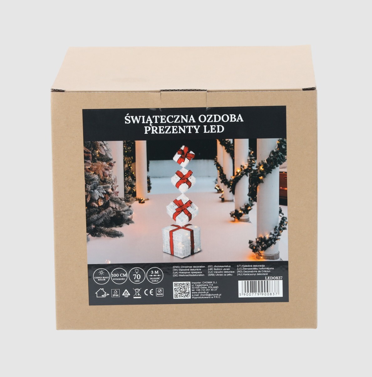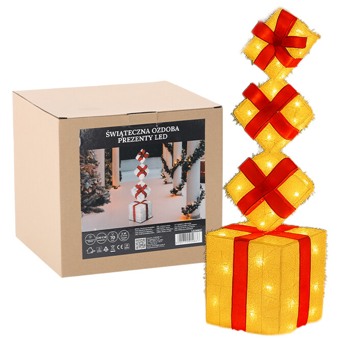 Ovaj upečatljivi LED božićni ukras, koji se sastoji od četiri kutije različitih veličina, ukrašen je sa 70 toplo bijelih LED dioda, stvarajući ugodnu i elegantnu atmosferu. S ukupnom visinom od 100 cm, set je savršen za ukrašavanje terase, vrta, izloga ili dnevnog boravka. S IP44 ocjenom, pogodan je za unutarnju i vanjsku upotrebu. To je savršen način da svom blagdanu dodate dašak čarolije.