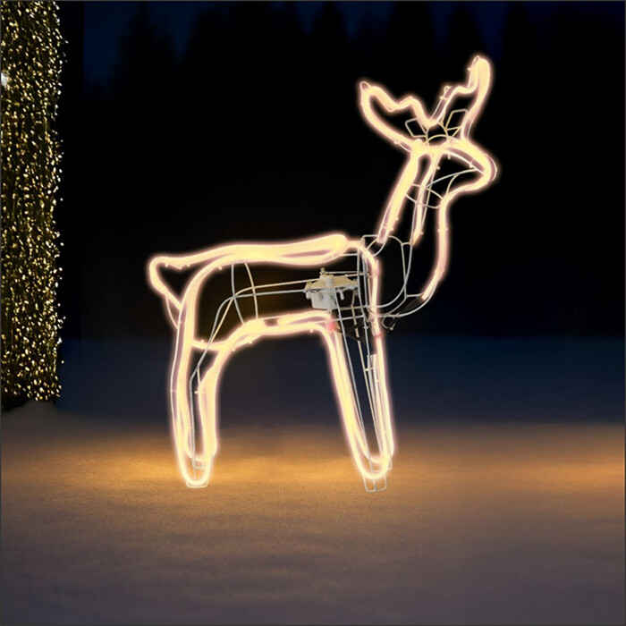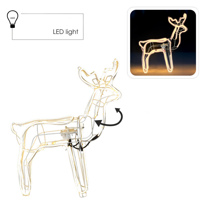 Ovaj LED božićni sob s pomičnom glavom ukras je koji će oduševiti svakog gosta i dodati šarm vašim aranžmanima. Izrađen od neonske LED cijevi i opremljen sa 720 toplo bijelih LED dioda, zrači elegantnim sjajem i pojačava blagdanski duh. Njegova IP44 zaštita i crni kabel za napajanje čine ga prikladnim za unutarnju i vanjsku upotrebu. Pokretna glava dodaje realizam, dok način rada stalnog osvjetljenja pruža atmosfersko osvjetljenje tijekom cijele večeri.