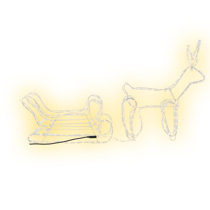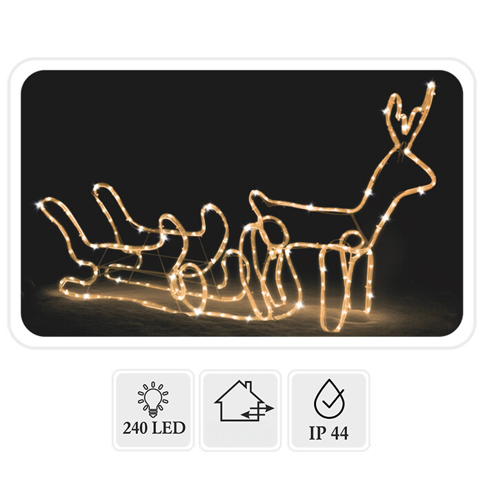 Ovaj upečatljivi LED set sobova i saonica jedinstven je ukras koji će stvoriti čarobnu blagdansku atmosferu. Zahvaljujući 240 toplo bijelih LED dioda, nadopunjenih hladnim efektom bljeska, ukras prekrasno osvjetljava prostor i privlači pažnju. Njegova IP44 zaštita i crni kabel za napajanje čine ga savršenim za unutarnju i vanjsku upotrebu. Način rada s konstantnim svjetlom s efektom bljeska dodaje dinamičan dodir, a impresivna ukupna duljina od 3,2 metra čini ovaj ukras središnjom točkom svakog božićnog aranžmana.