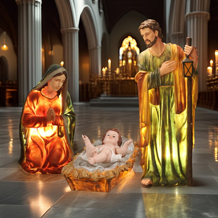 Ovaj profesionalni set božićnih figura izrađen je od izdržljive polirezine(epoxy) uz vrhunsku završnu obradu i fine detalje, idealan za crkve, hotele, trgovačke centre i reprezentativne prostore. Model je pod svjetlima (LED) za dodatni naglasak ugođaja. Uz komplet, moguća je i kupnja zasebnih figura (Sveta obitelj, kraljevi, pastiri, životinje) za nadogradnju postojećih jaslica ili prilagodbu prostora.