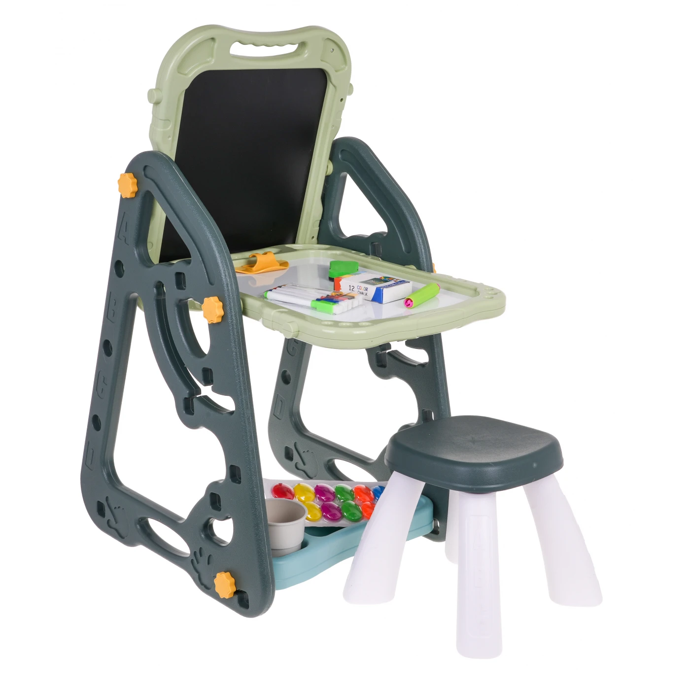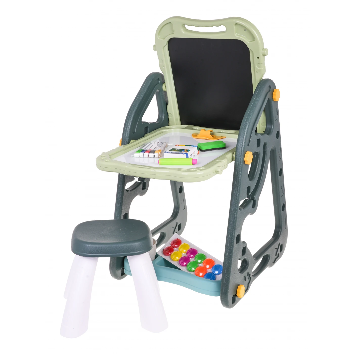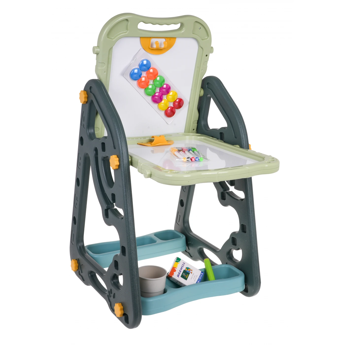 Ovaj veliki, višenamjenski set, koji se sastoji od dvije ploče: ploče s magnetskom kredom i magnetske ploče, te stolice, prikladan je za djecu od 3 godine i više. Okvir ploče može se postaviti na dva načina. Prva opcija ima magnetsku ploču s jedne strane i ploču s kredom s druge. Visina ploča također se može podesiti. Druga opcija ima stol s dvije ploče na vrhu i susjednom zidu. Bijela strana može se koristiti za pisanje markerima ili pričvršćivanje magneta u boji. Crna strana može se koristiti za crtanje kredom, a također i za pričvršćivanje magneta u boji.