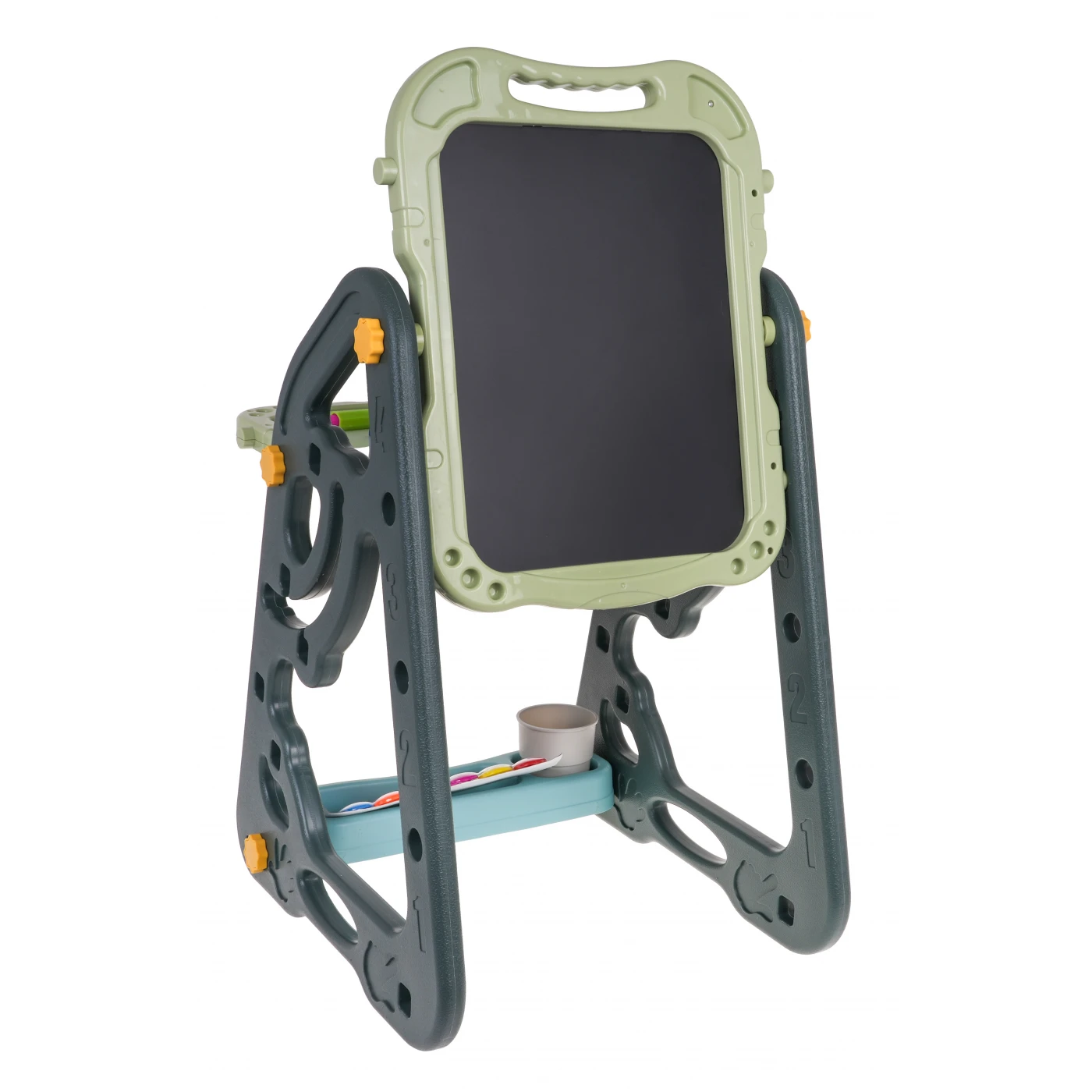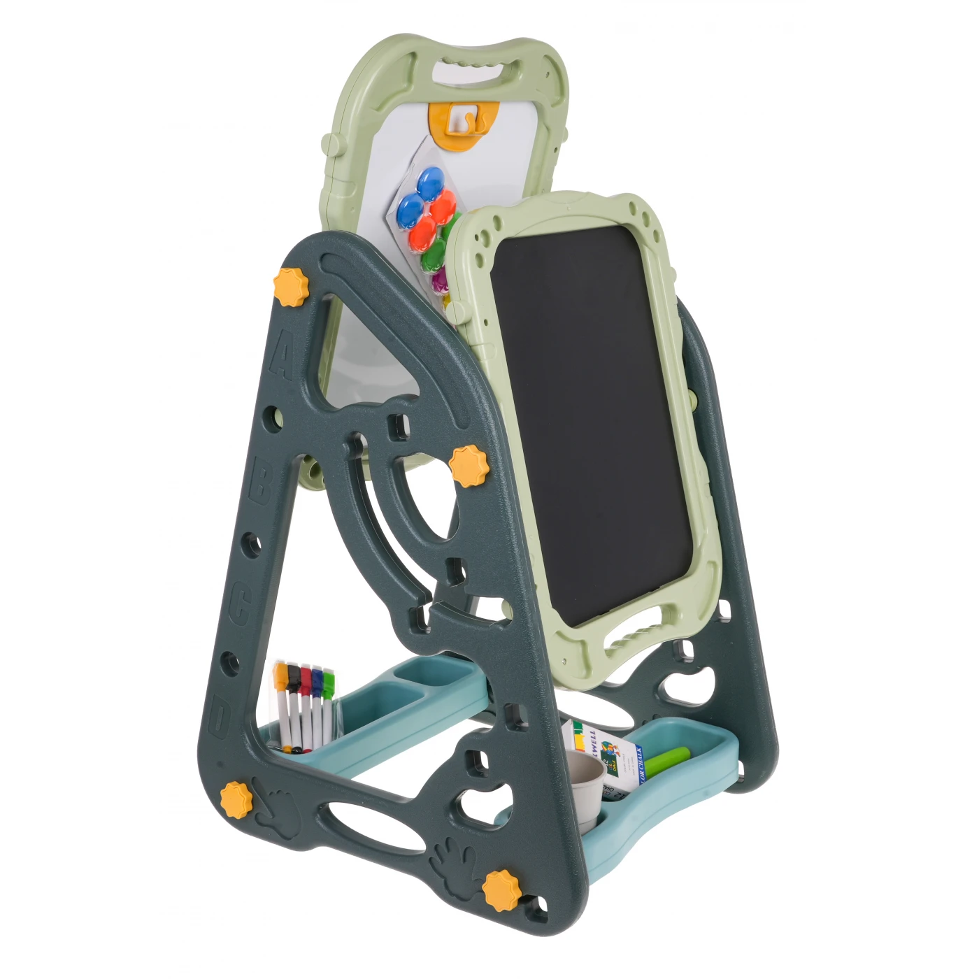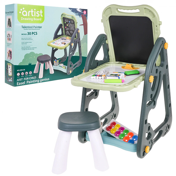 Set uključuje dvije police za pribor za slikanje i dodatke poput čaše za vodu, krede, markera, magneta itd. Set je siguran, sa svim zaobljenim rubovima za sigurnu upotrebu. Lako se sastavlja i rastavlja. Zahvaljujući ploči, djeca mogu istovremeno stimulirati svoju maštu, koncentraciju i ručnu spretnost tijekom igre. |