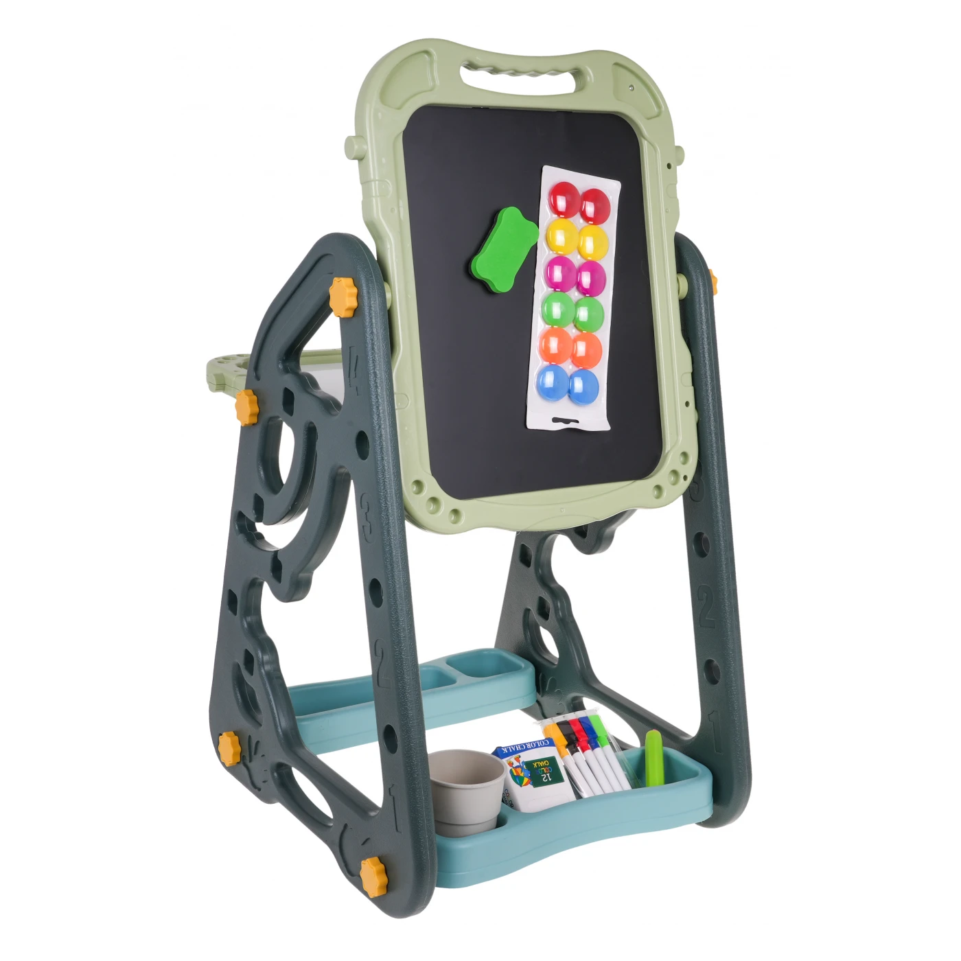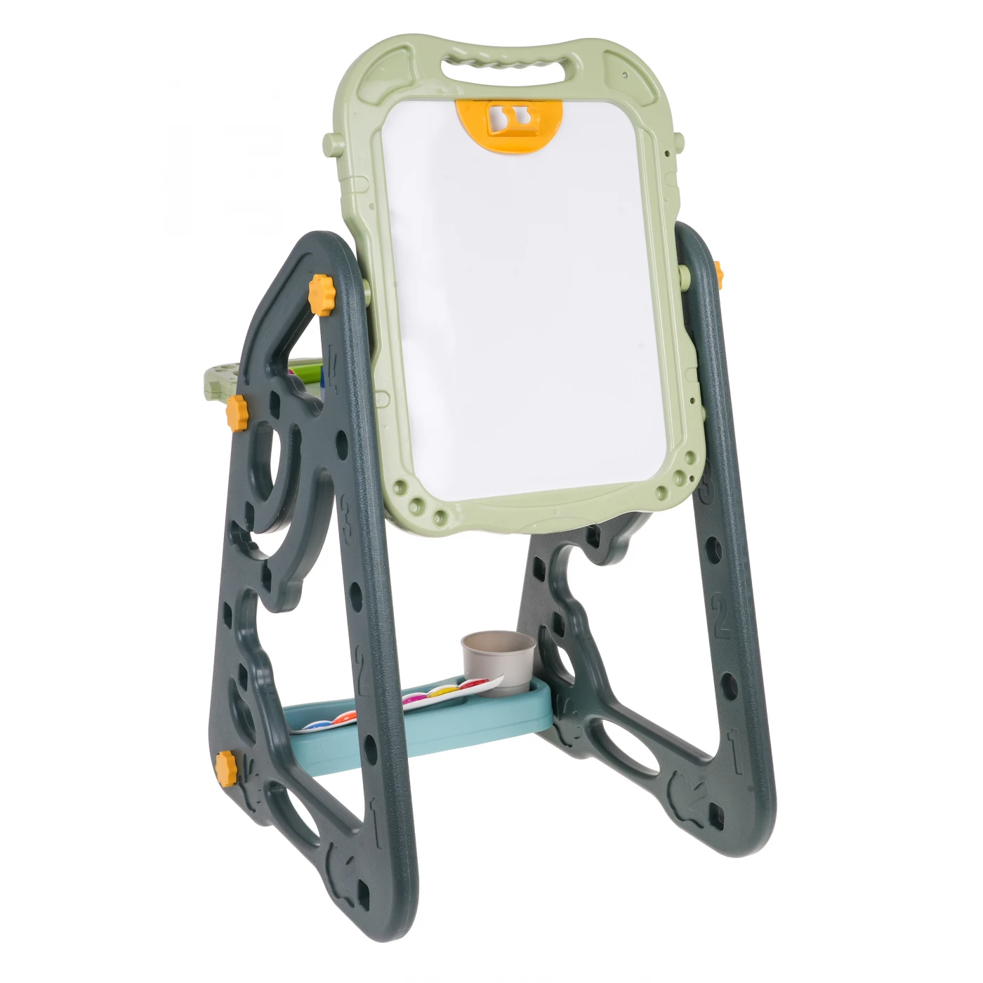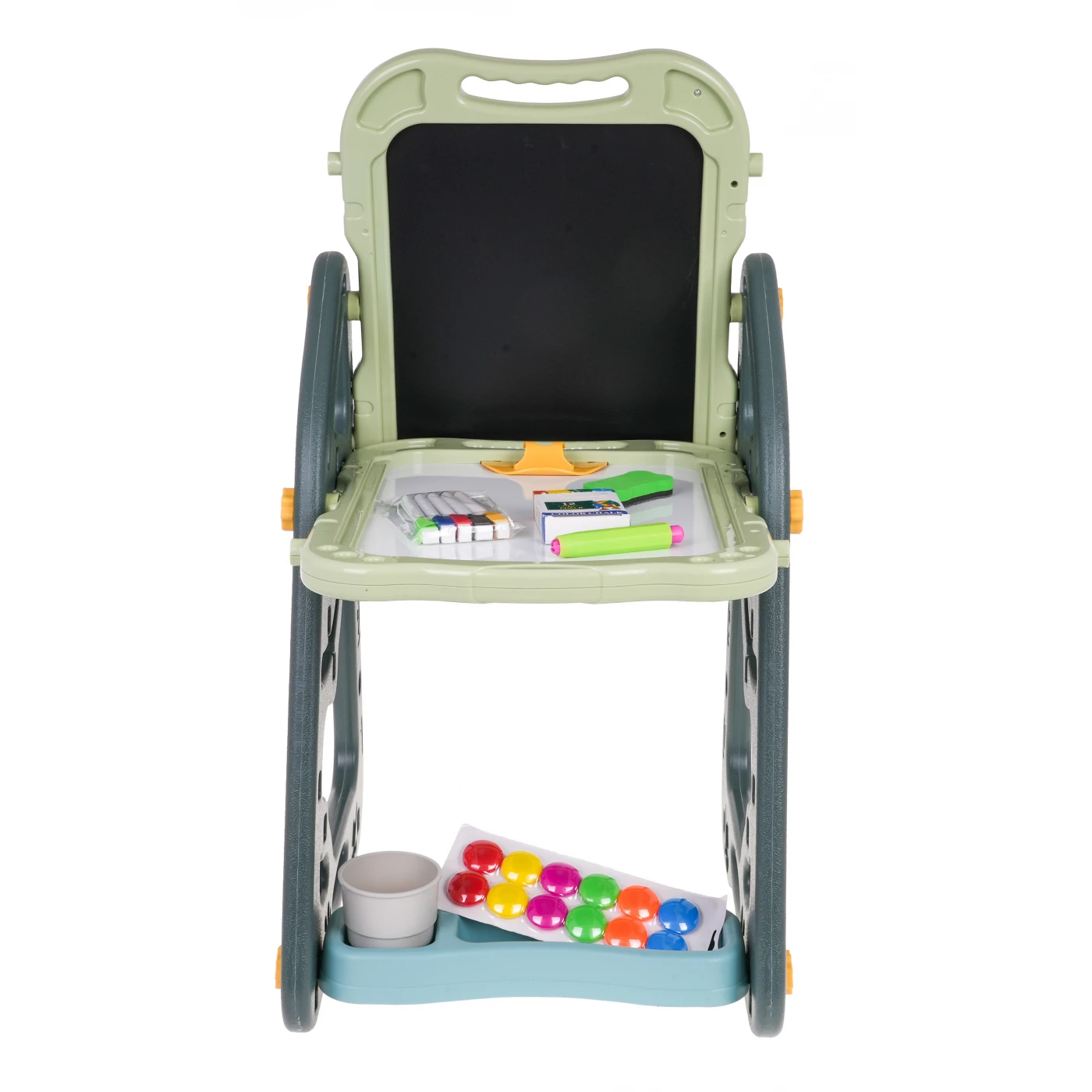 Set uključuje dvije police za pribor za slikanje i dodatke poput čaše za vodu, krede, markera, magneta itd. Set je siguran, sa svim zaobljenim rubovima za sigurnu upotrebu. Lako se sastavlja i rastavlja. Zahvaljujući ploči, djeca mogu istovremeno stimulirati svoju maštu, koncentraciju i ručnu spretnost tijekom igre. |