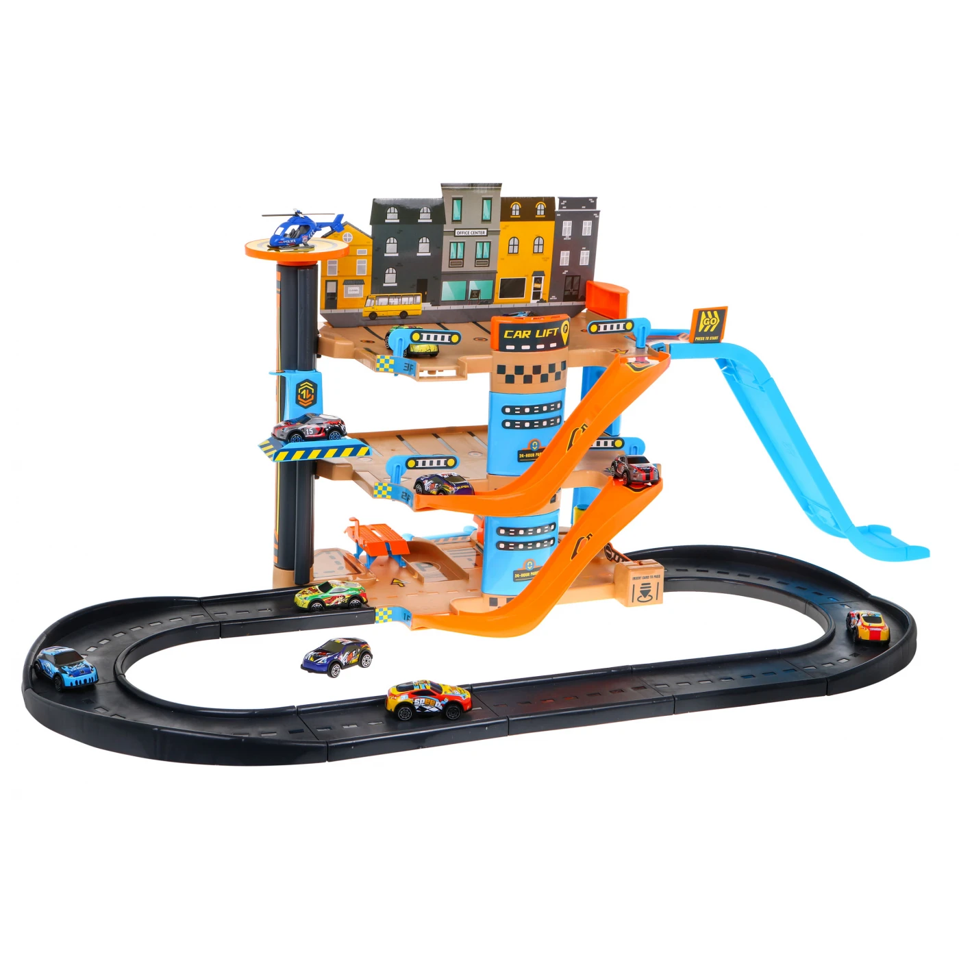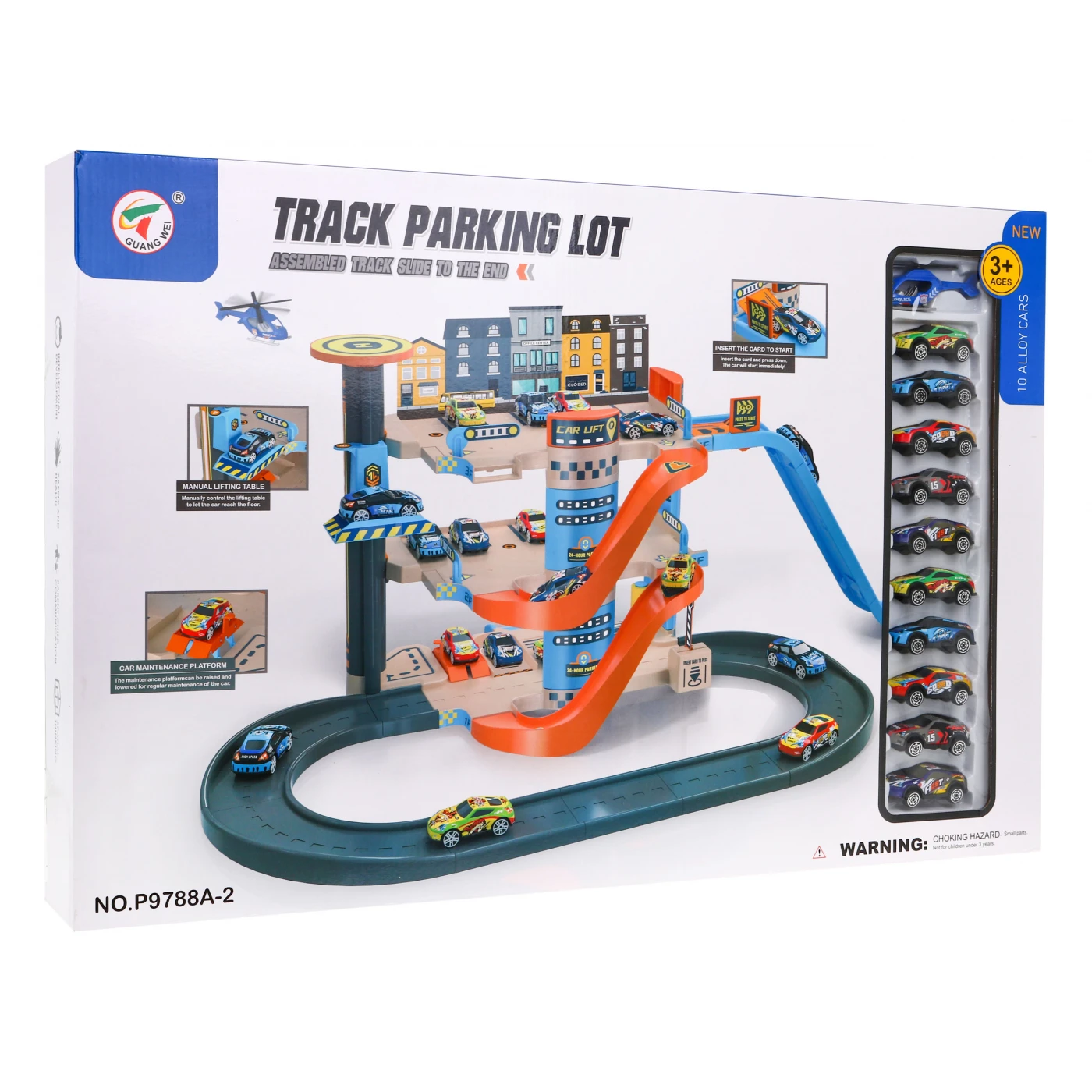 Ovo veliko, čvrsto izgrađeno parkiralište s deset aluminijskih vozila i helikopterom idealno je za djecu od tri godine i stariju. Parkiralište se sastoji od četiri etaže. Na gornjoj etaži nalazi se sletište za helikopter. Ispod se nalaze parkirna mjesta i tobogan za automobile koji vode do donje etaže. Na drugom katu nalaze se parkirna mjesta i tobogan za prizemlje. Ispod se nalaze autopraonica, benzinska postaja i mobilna platforma za održavanje. Do svake etaže se može doći liftom. Lift ne zahtijeva baterije; njime se upravlja ručno.