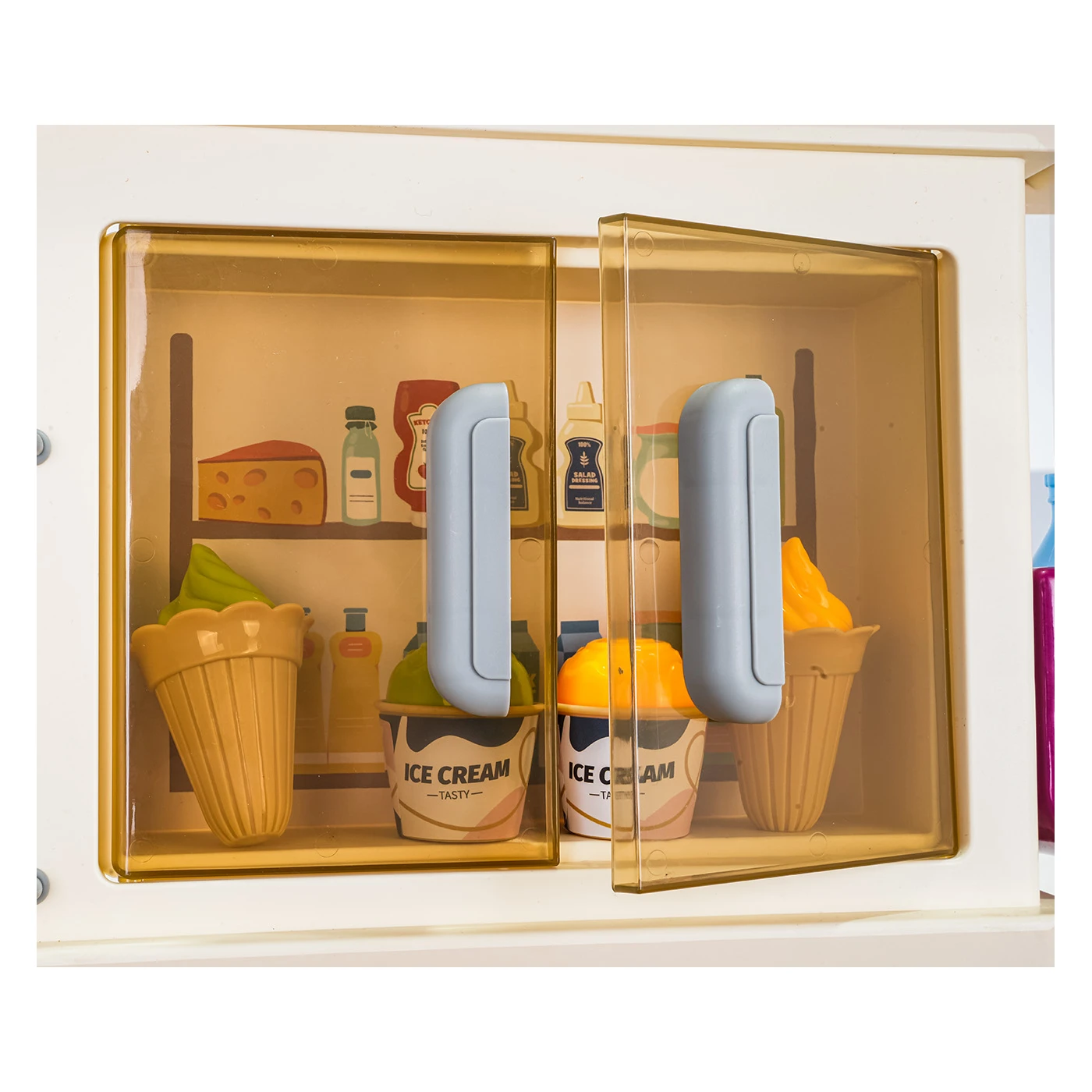 – lažni prehrambeni proizvodi: zelena salata, zelena paprika, limeta, naranča, gljive, hamburger, hot dog, sendvič, mrkva, umak od jagoda, umak od naranče, 2 x kukuruz, limun, tvrdo kuhano jaje, zeleni krastavac, grašak, odrezak, piletina (batak, krilo), prženo jaje, riba, kobasice, kečap, kartoni keksa, mlijeko i sladoled, čokoladno mlijeko, instant juha,