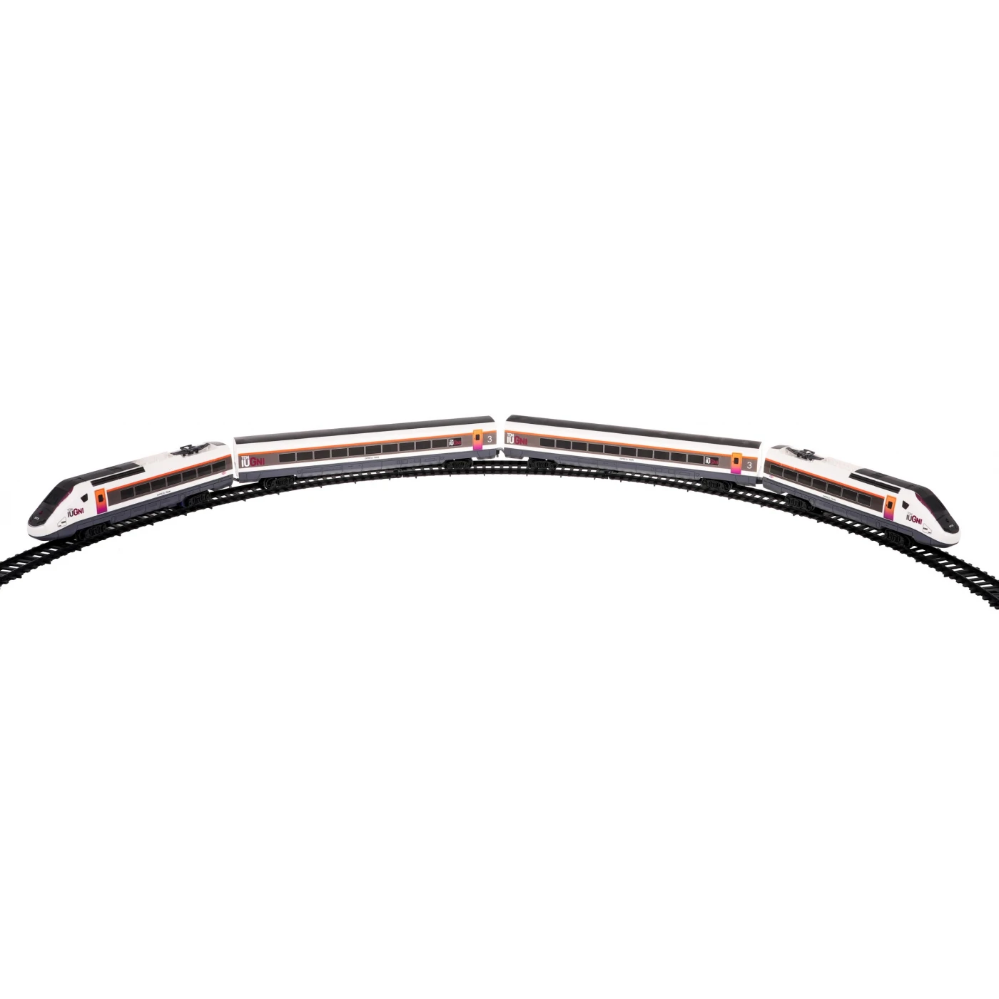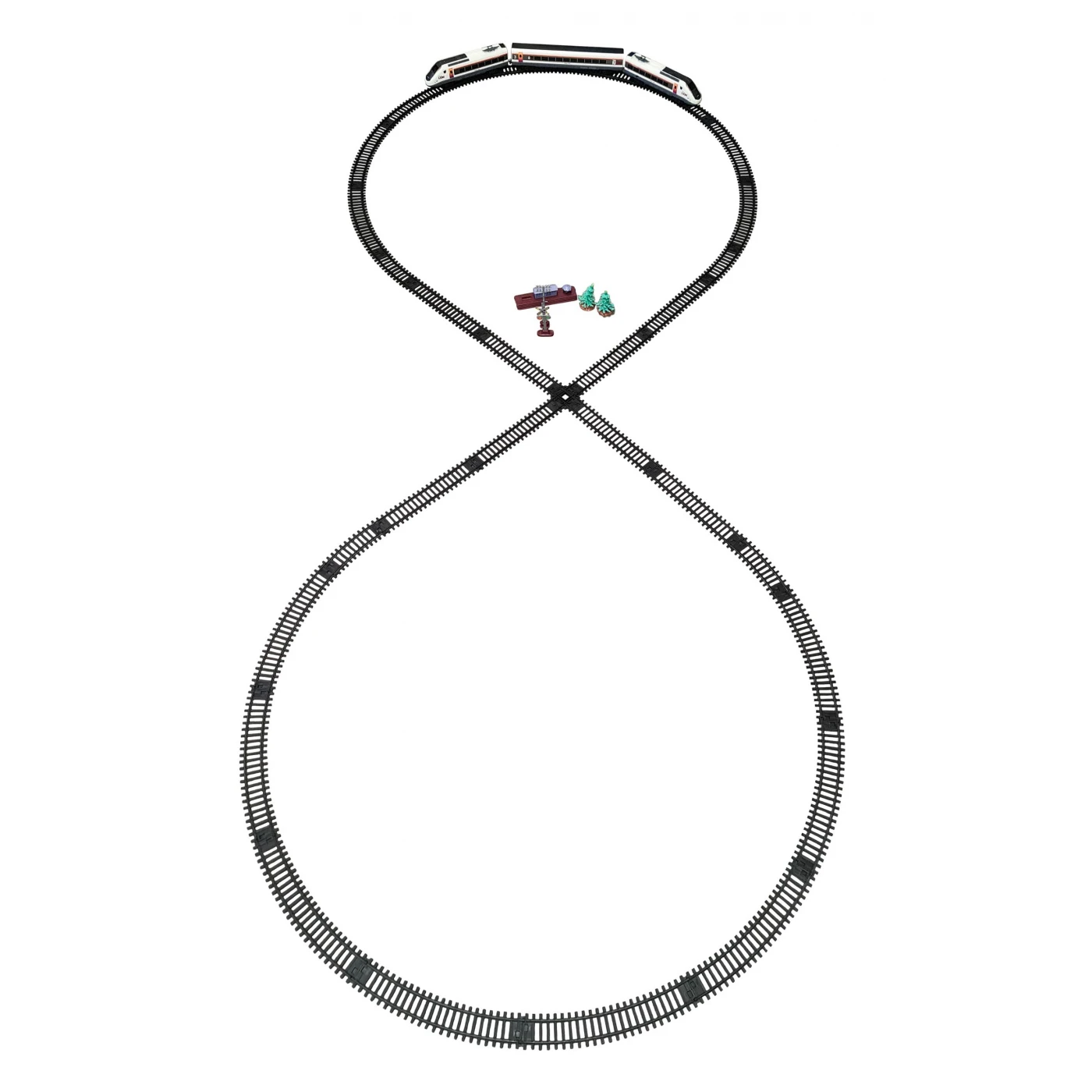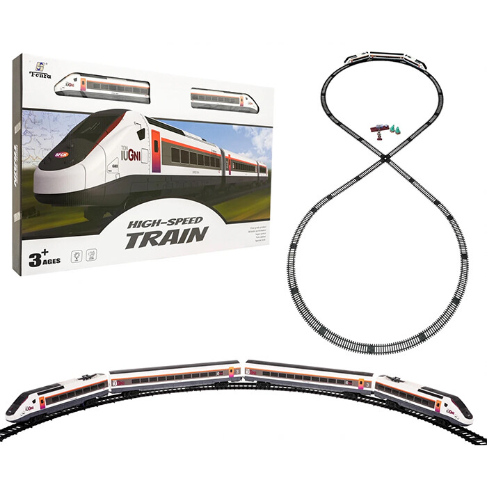 – tračnice sa skretnicama (+914 cm), – lokomotiva s regulacijom brzine, – 4 putnička vagona, – 2 velika tunela, – pokretni most, – ukrasni dodaci: drveće, zgrade, znakovi – šareno pakiranje, idealno za poklon. |