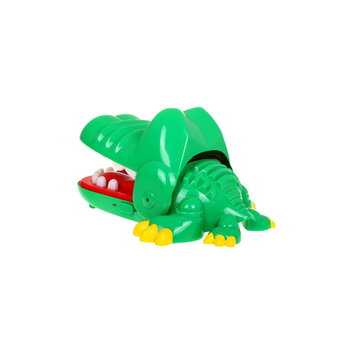 Krokodil hrabro otvara usta, otkrivajući niz prekrasnih, ravnih zuba. Nažalost, jedan među njima boli. Da biste to učinili, pritisnite bilo koji zub pojedinačno prstom (ako ima više igrača, radite to jednog po jednog). 3 VARIJANTE IGRE: 1. ZUBOBOLJA – crveni gumb – pokreće prvu varijantu igre. – Nakon pritiska počinje zabava: pritiskajte zub po zub… ako pogodite zub koji boli, krokodil će ugristi! Gubite. 2. IGRA REFLEKSIMA: – pritisnite zub koji emitira narančasto svjetlo, – brzo pritisnite zube koji se pale jedan za drugim; brzina paljenja će se povećati, – ako se dva zuba istovremeno upale, pokušajte ih pritisnuti jedan za drugim što je brže moguće, – ako tri puta krivo pritisnete, krokodil će zatvoriti usta; gubite, igra je gotova. – Nakon igre, broj zuba koji se upale bit će vaša razina refleksa. 3) PAMĆENJE: – pritisnite zeleni svjetleći zub, – zapamtite svjetleće zube, – kada krokodil pita “Koji zub boli”, pritisnite zapamćene zube, – možete pokušati ponovno ako je vaš odgovor točan, – broj osvijetljenih zuba će se povećati, a vrijeme njihovog sjaja će se skratiti. – ako netočno odgovorite, krokodilova će se usta zatvoriti i ugrist će vas za prst. |
