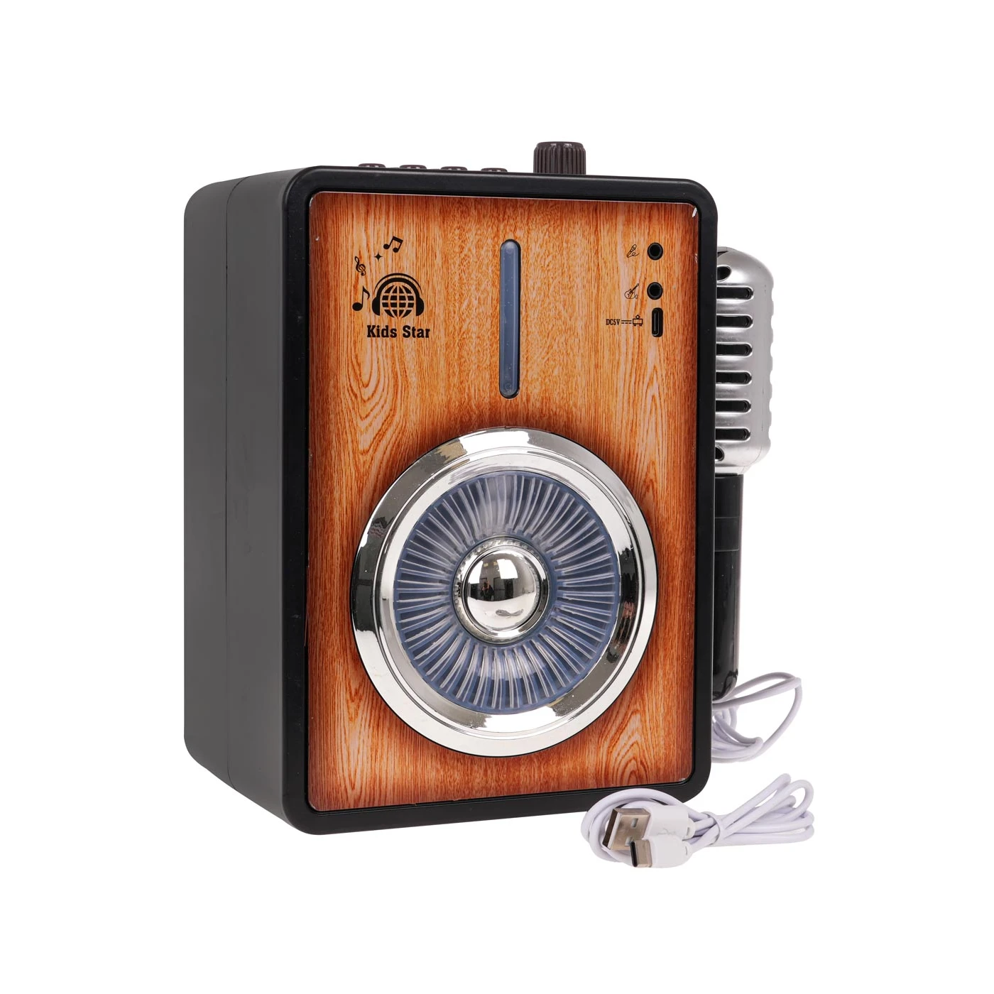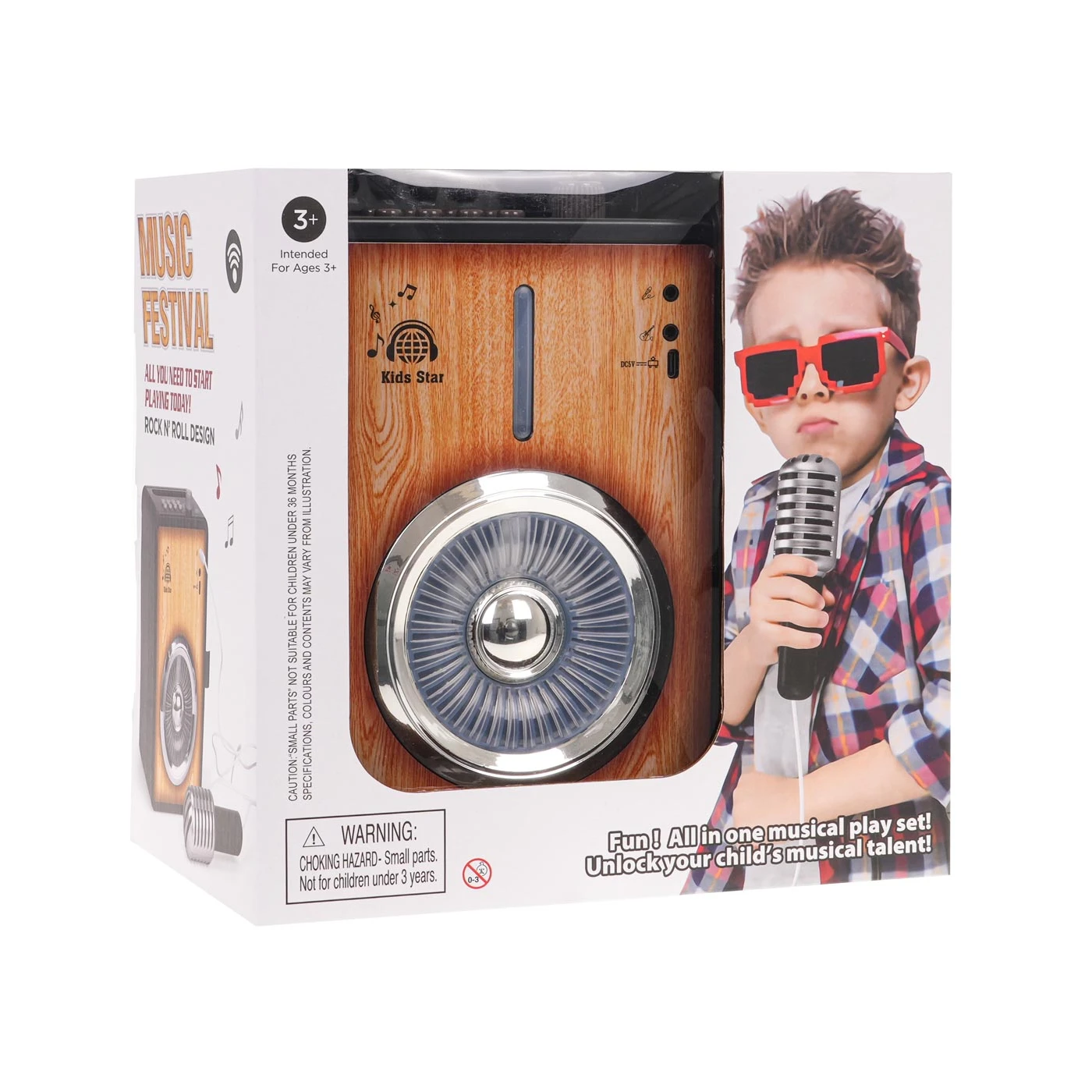 Ovo prekrasno izrađeno pojačalo s mikrofonom i Bluetooth funkcijom savršeno je za djecu od 3 godine i više. Set izgleda vrlo profesionalno i prepun je značajki. Gornji dio ima funkcijske tipke i gumb za glasnoću. Okrenite gumb da biste čuli glazbu i bljeskajuća svjetla, potičući igru. Pritiskom na prvi gumb s lijeve strane reproducirat će se pjesma, jedna od osam rock pjesama. Pritiskom na gumb za glazbenu notu aktivira se jedna od 8 dječjih melodija. Gumb za pljeskajuće ruke aktivira jedan od 9 zvučnih efekata, poput pljeska. Gumb za bubanj aktivira jedan od 3 ritma udaraljki. Tu je i gumb za spajanje pojačala na vanjski uređaj, poput telefona, putem Bluetootha. Ostali gumbi koriste se za snimanje i reprodukciju glasa. Gumb za svjetlo mijenja osvjetljenje zvučnika. Možete birati između 9 svjetlosnih uzoraka. Iznad zvučnika nalazi se ulaz za mikrofon (uključen u komplet), priključak za spajanje gitare i priključak za punjenje. Igračku napajaju 3 x AAA 1,5 V baterije (nisu uključene).