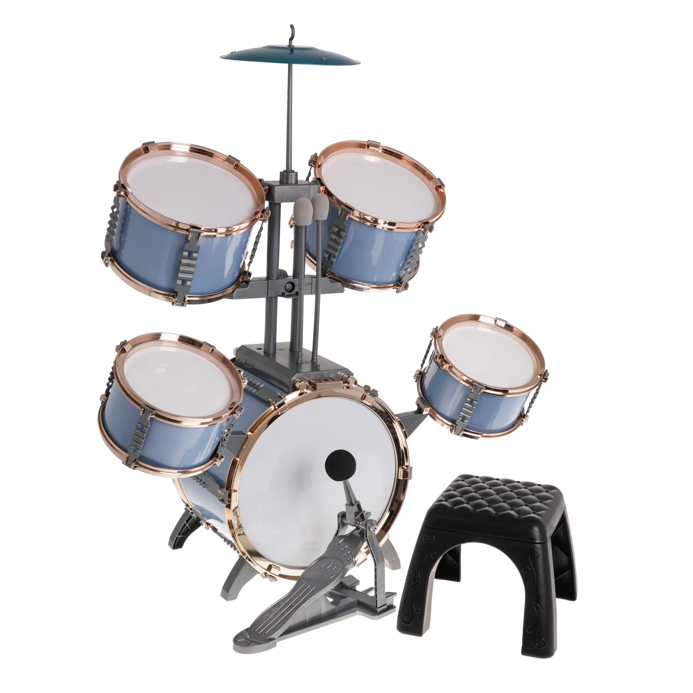 | Ovaj veliki, plavi set bubnjeva sa stolicom je igračka za djecu od 3 godine i više. Set uključuje 5 bubnjeva, metalnu činelu, 2 čekića i stolicu. | |