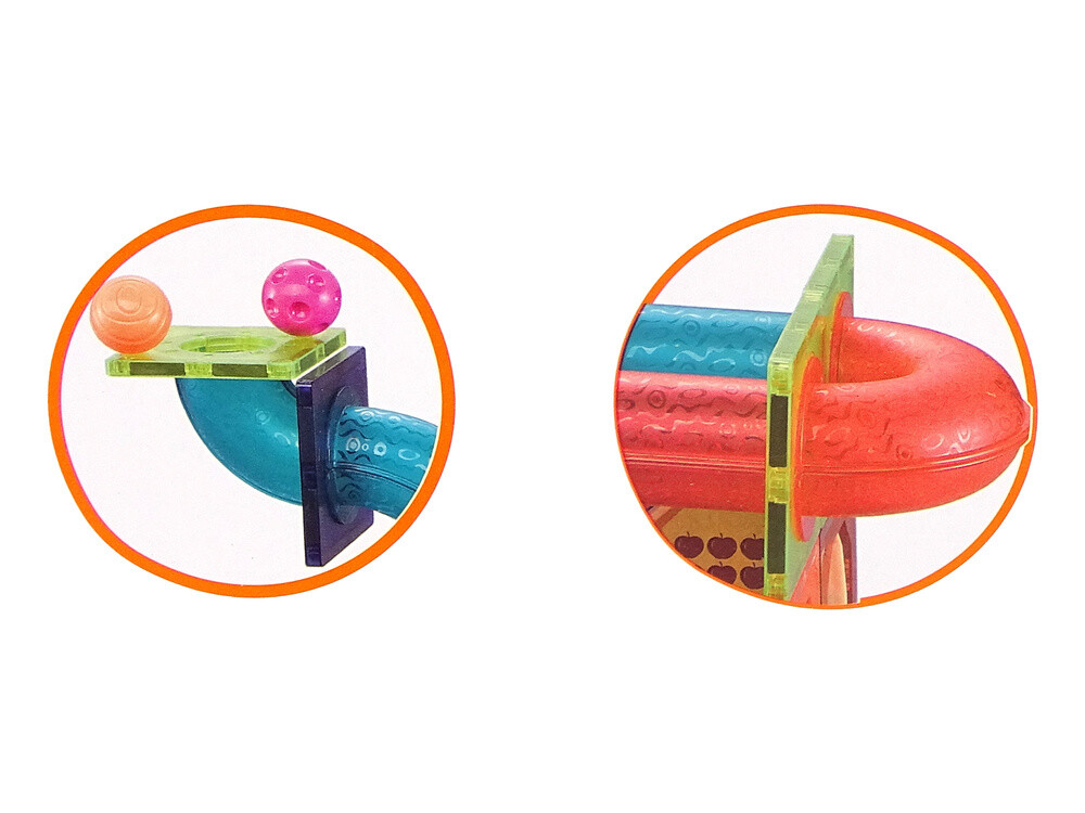 Šareni oblici i teksture seta stimuliraju osjetila vašeg djeteta. Kocke se spajaju magnetima, što vam omogućuje stvaranje trodimenzionalnih struktura u raznim konfiguracijama. Sve ovisi o vašoj mašti. Komadi se mogu koristiti za izgradnju mramorne staze ili tobogana.