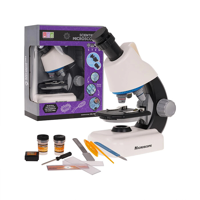 Bijeli mikroskop za mlade istraživače je edukativni komplet za djecu u dobi od 6 godina i više koja žele istražiti tajne prirode i mikrosvijeta. Izrađen od visokokvalitetnih materijala, mikroskop omogućuje promatranje objekata pri povećanju do 1200x .