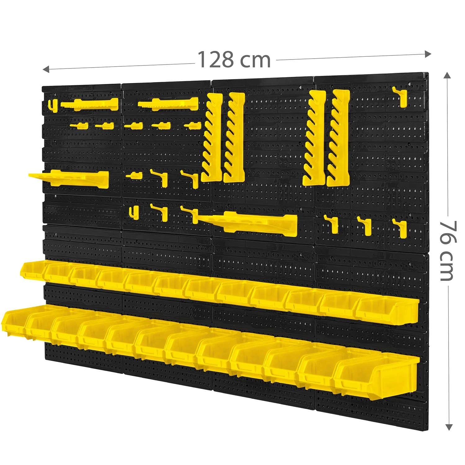 Ova zidna ploča dimenzija 128 x 76 cm posebno je dizajnirana za upotrebu u radionici – savršena je za pohranu i organiziranje alata i pribora. Savršena je i za profesionalne radionice i za kućne garaže.
