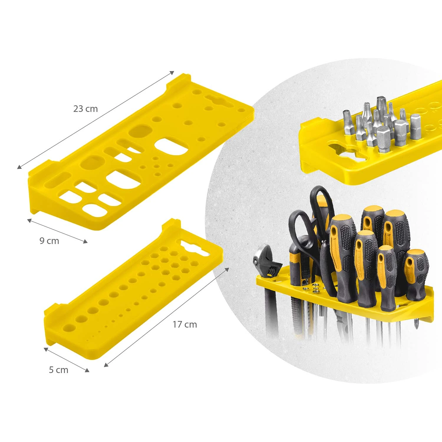 - Držači i kuke omogućuju vam vješanje alata poput kliješta, čekića ili odvijača, održavajući vašu radionicu urednom.
