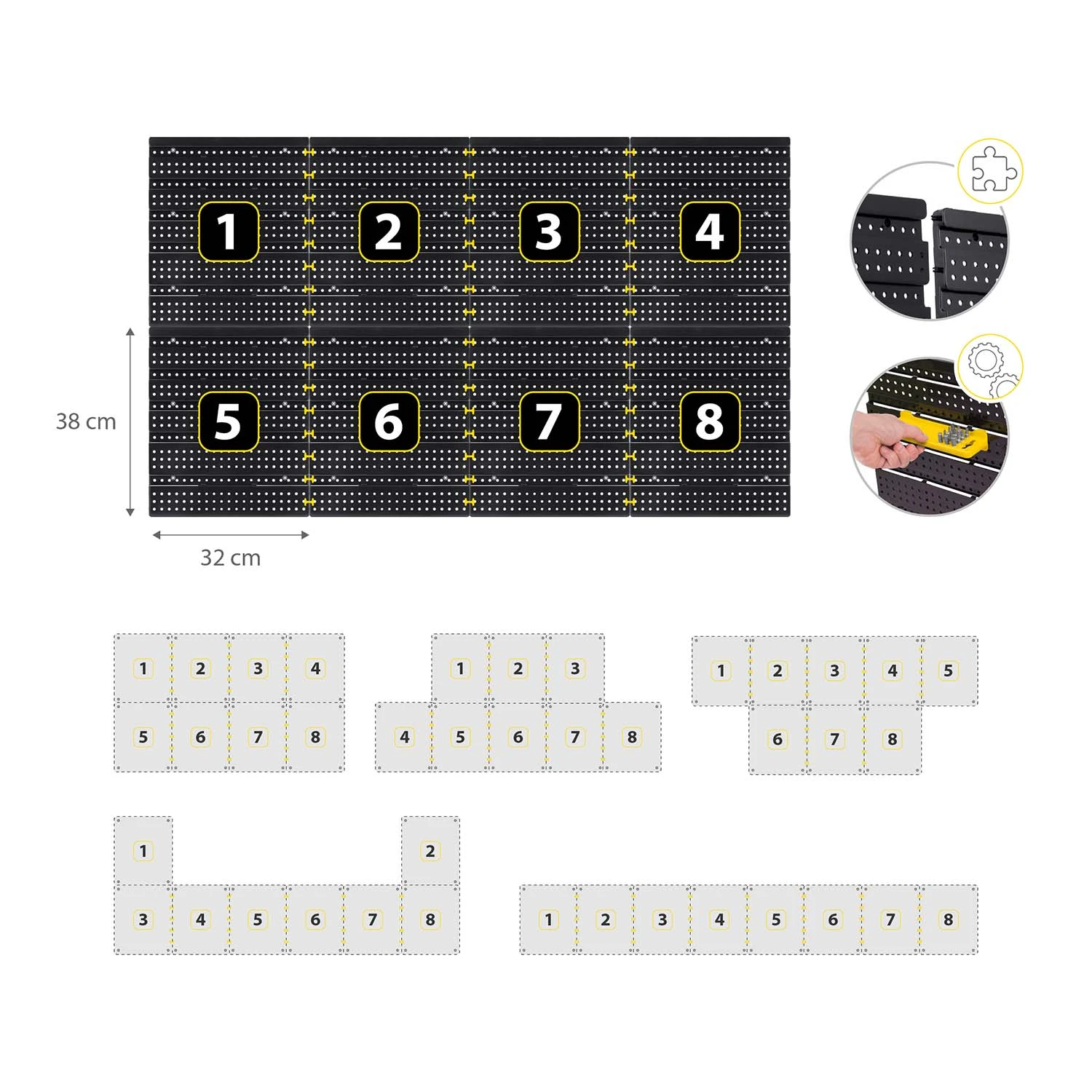 Alatna ploča ima modularni dizajn, što vam omogućuje slobodno kombiniranje panela i prilagođavanje rasporeda vašim potrebama. Jednostavna montaža omogućuje brzo i jednostavno spajanje pojedinačnih elemenata, a različite kombinacije pružaju fleksibilnost u organizaciji vašeg radnog prostora.