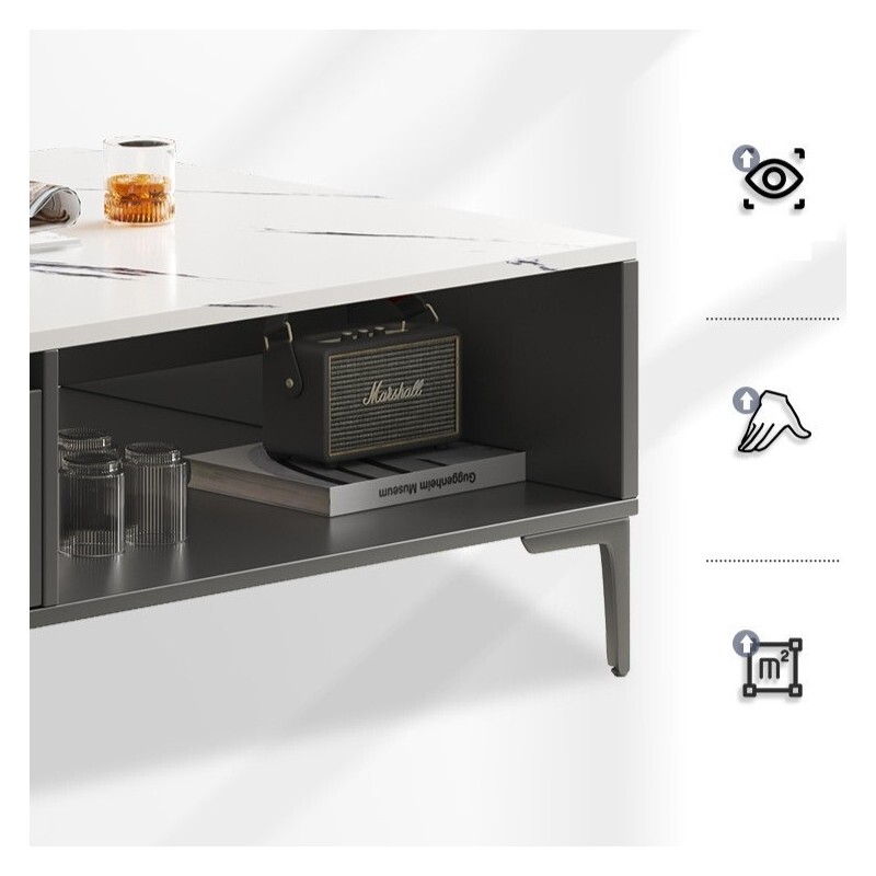 Njegova dvostruka površina pruža dodatni prostor za odlaganje, dok siva ploča s efektom mramora i crne noge daju luksuzan dojam svakom interijeru.