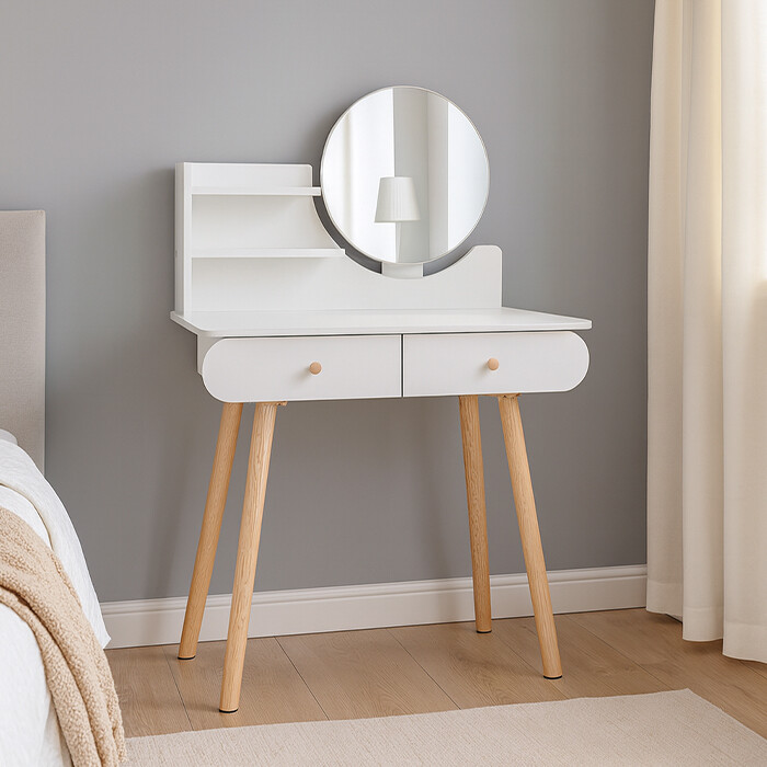 Toaletni stolić nije samo funkcionalan komad namještaja 🗄️ već i elegantan dodatak vašoj spavaćoj sobi ✨. Zahvaljujući dobro osmišljenom dizajnu, sva vaša kozmetika 💄, nakit 💍 i modni dodaci naći će svoje mjesto, pružajući vam udobnost i red 🪄 . 🪞 Okruglo ogledalo osigurava praktičnost tijekom svakodnevnog nanošenja šminke, a minimalistički stil 🏡 uklopit će se u svaki moderni interijer.