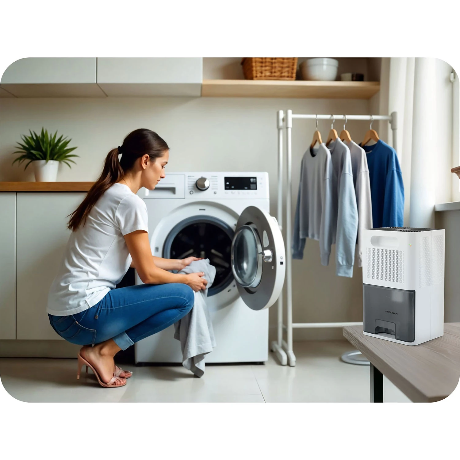 - Smanjuje vrijeme sušenja odjeće – odvlaživač zraka intenzivno suši zrak, ubrzavajući prirodni proces isparavanja vlage iz rublja.