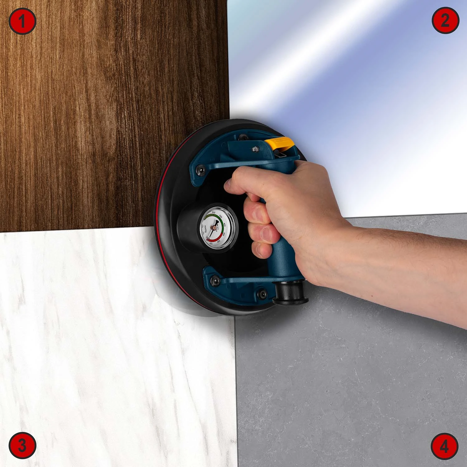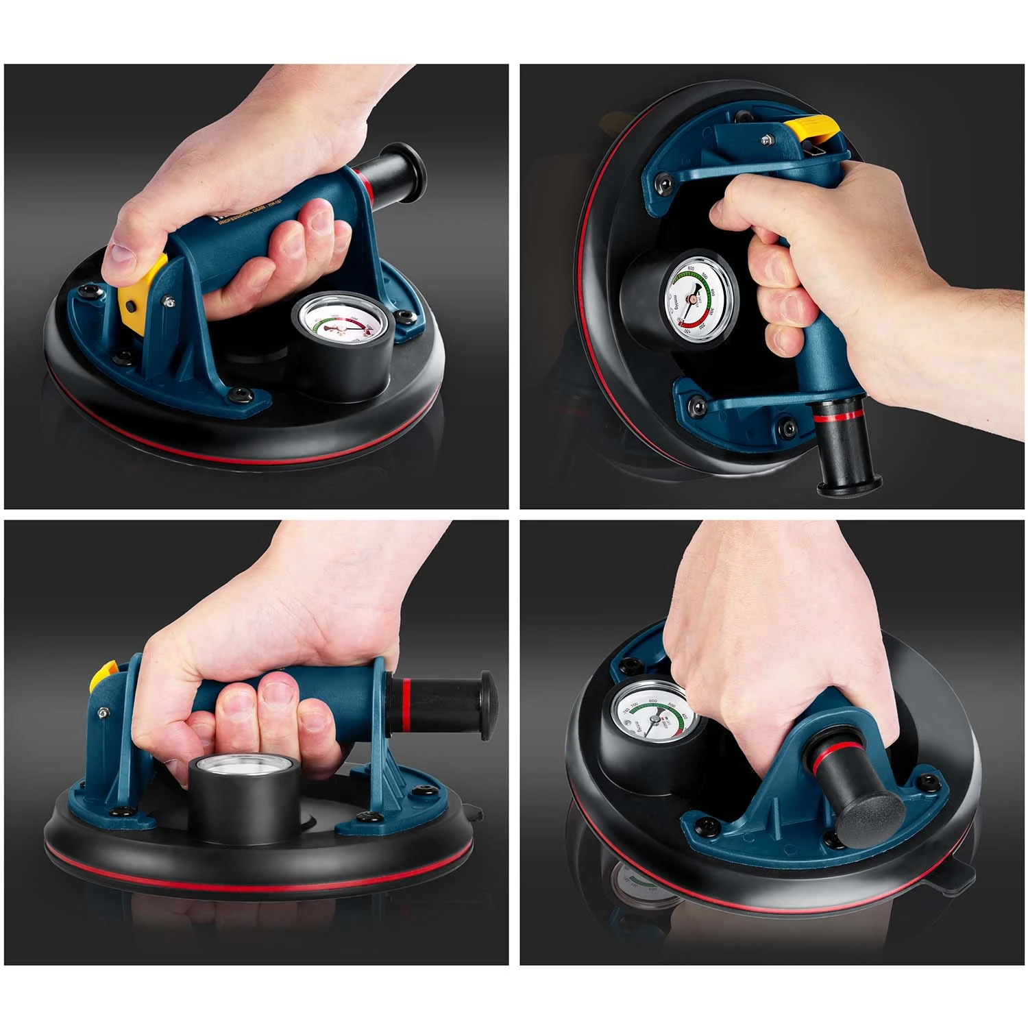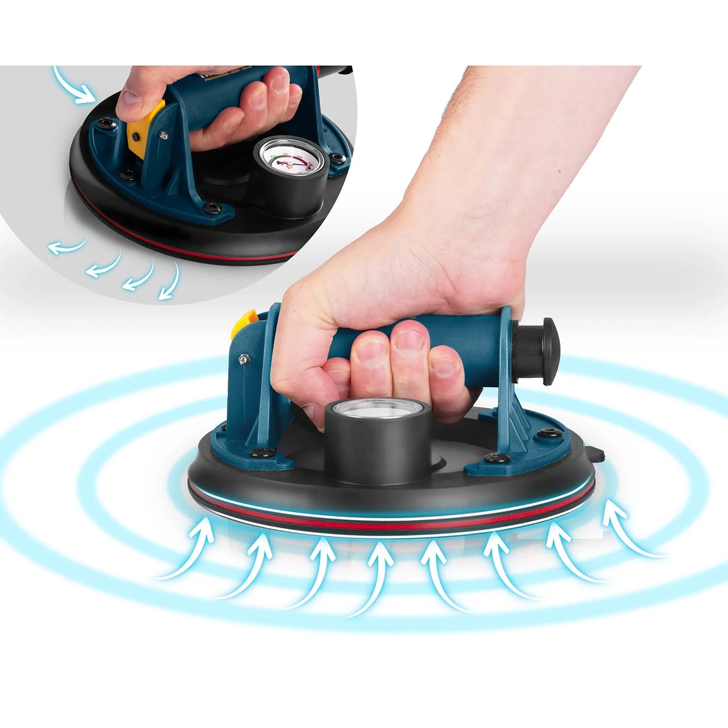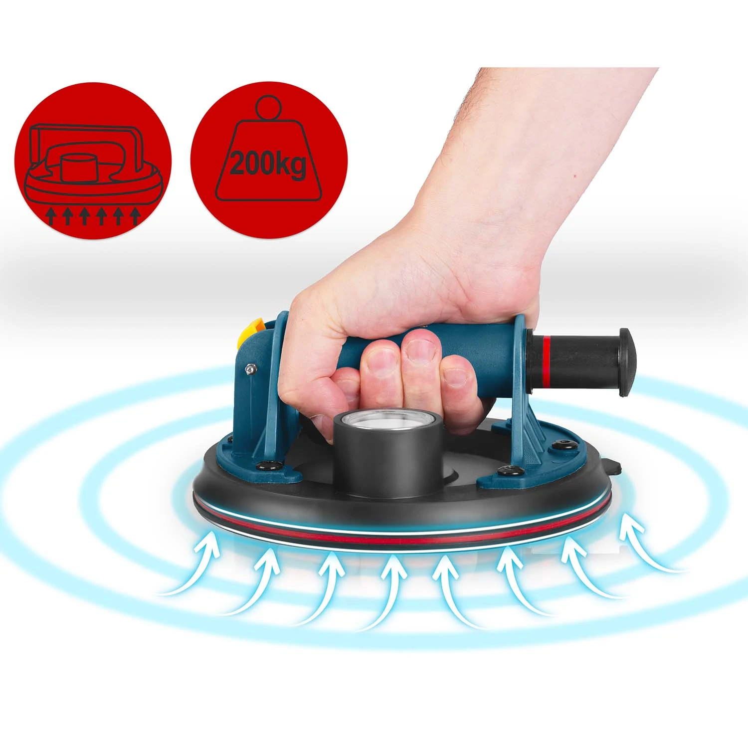 Kada se nanese na glatku površinu, ručna pumpa usisava zrak ispod gumenog diska, stvarajući snažan vakuum koji ga čvrsto “lijepi” za materijal.